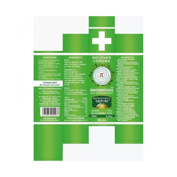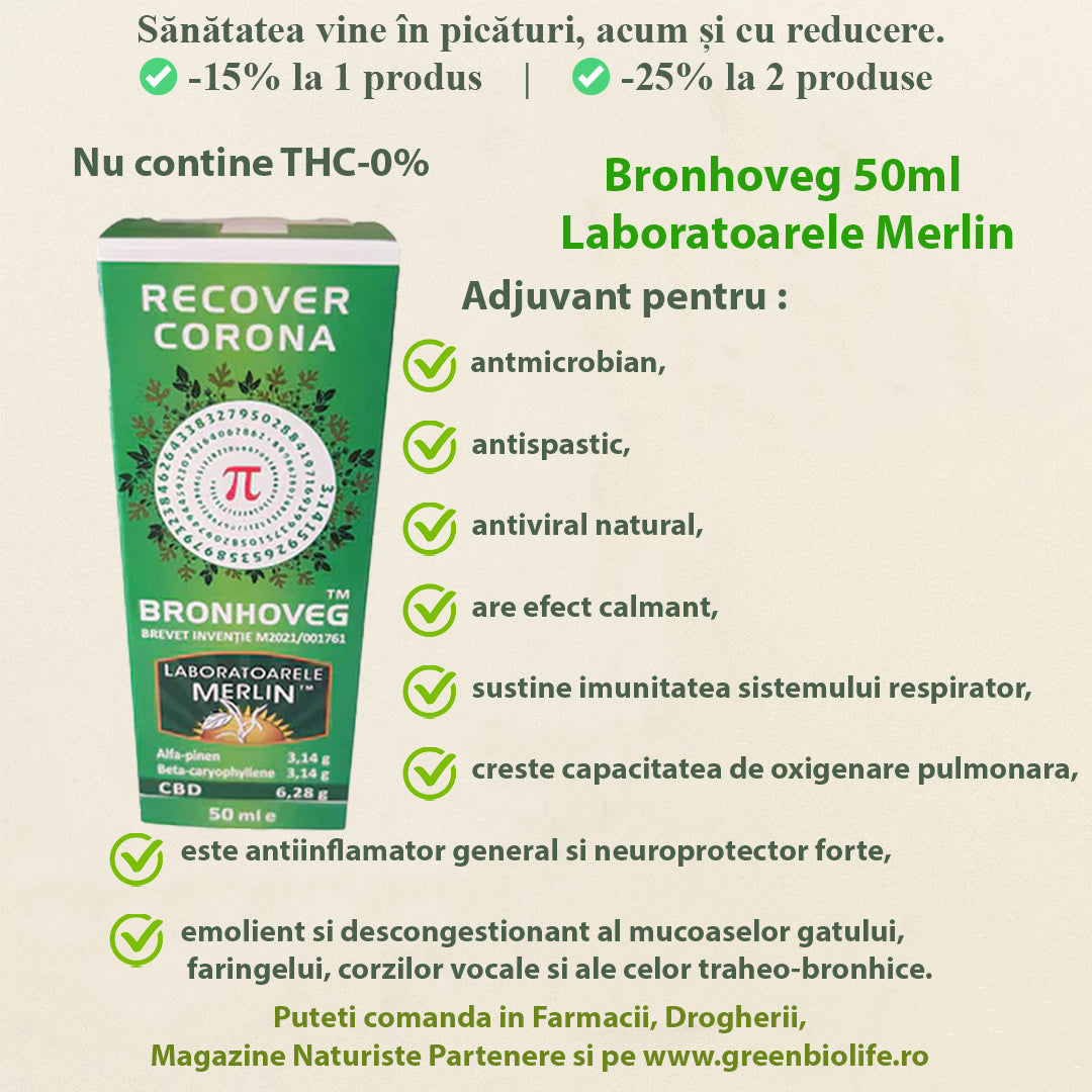 Uleiul Bronhoveg este `cel mai puternic inhibitor al virusului virozei pulmonare mucolitice`, conform recomandarilor dr. Liviu Duca si dr. Florin Lele. 50ml din acest ulei contin 3.14g alfa-pinen, 3.14g ceta-caryophyllene si 6.28g CBD. Un produs indispensabil din fiecare locuinta!