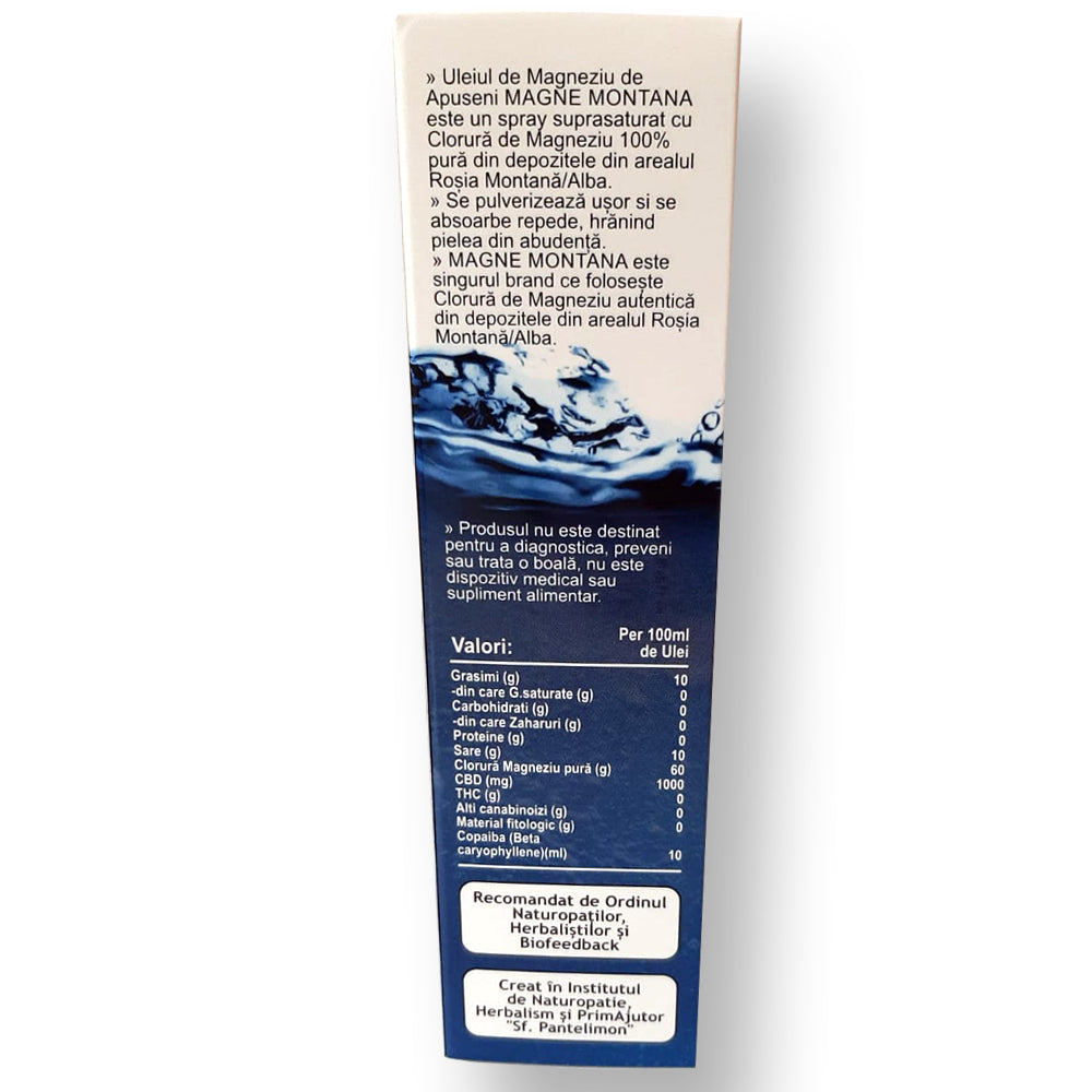 Atentie: Deficitul de magneziu duce la greturi, varsaturi, pierderea poftei de mancare, ameteli, furnicaturi, depresie si chiar moarte subita. Deficitul se regaseste in toate bolile de plamani, scaderea imunitatii si nu in ultimul rand de Covid 19. Magne Montana – Ulei de Magneziu de Apuseni se absoarbe foarte repede in piele, reduce oboseala si creste energia fiind adjuvamt in procedurile post Covid, bolile pulmonare sau sportivii de performanta (inclusiv fitness intensiv), ia migrenele cu mana-benefic in durerile de cap, indeparteaza stresul. Creste raspunsul imunitar al organismului, ajuta la ameliorarea simptomelor provocate de tratamentele pentru cancer [in paralel cu folosirea cannabidiolului CBD-20%,30%- Laboratoarele Merlin].