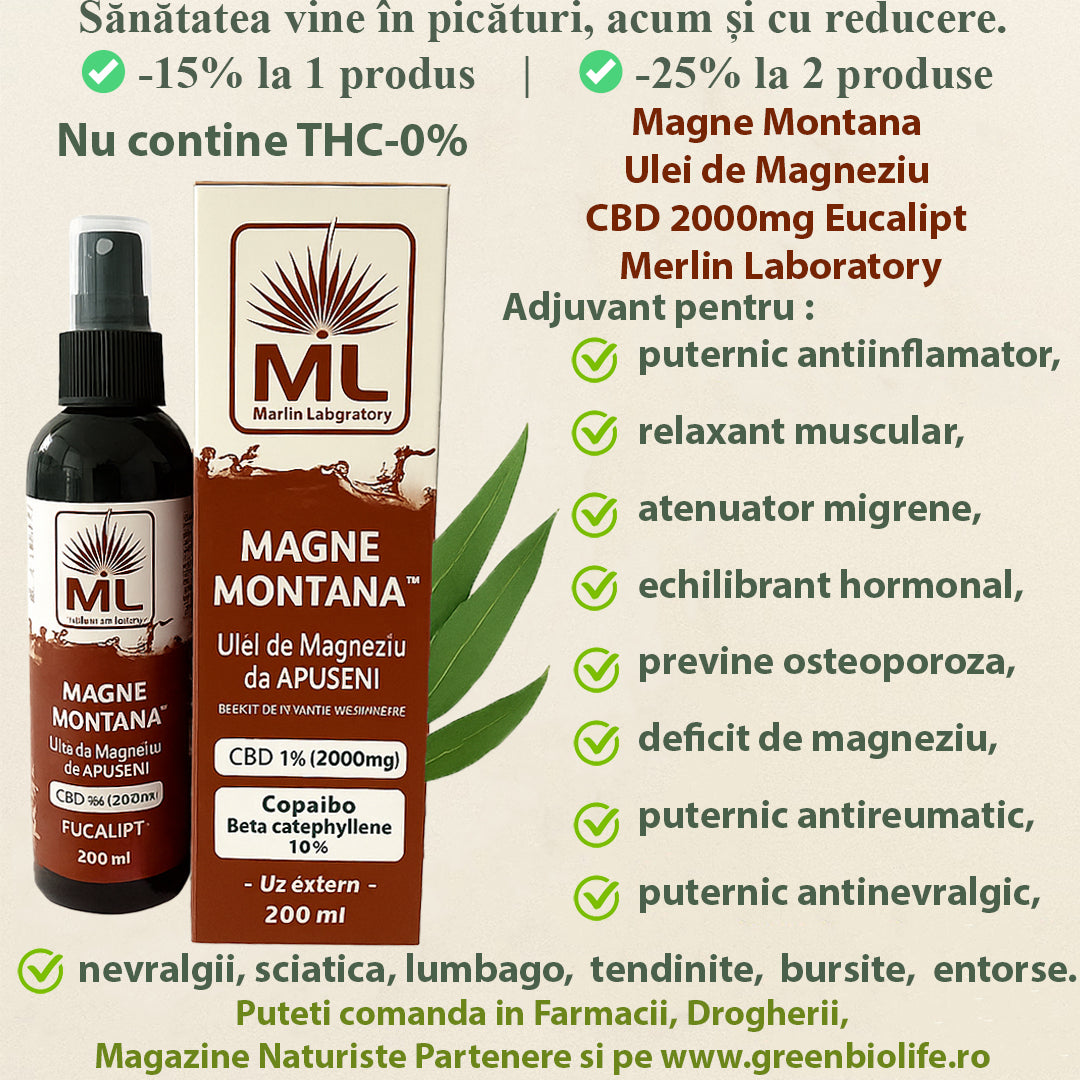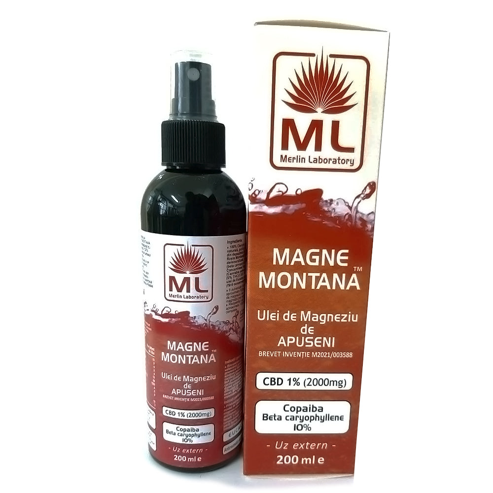 Atentie: Deficitul de magneziu duce la greturi, varsaturi, pierderea poftei de mancare, ameteli, furnicaturi, depresie si chiar moarte subita. Deficitul se regaseste in toate bolile de plamani, scaderea imunitatii si nu in ultimul rand de Covid 19. Magne Montana – Ulei de Magneziu de Apuseni se absoarbe foarte repede in piele, reduce oboseala si creste energia fiind adjuvamt in procedurile post Covid, bolile pulmonare sau sportivii de performanta (inclusiv fitness intensiv), ia migrenele cu mana-benefic in durerile de cap, indeparteaza stresul. Creste raspunsul imunitar al organismului, ajuta la ameliorarea simptomelor provocate de tratamentele pentru cancer [in paralel cu folosirea cannabidiolului CBD-20%,30%- Laboratoarele Merlin].