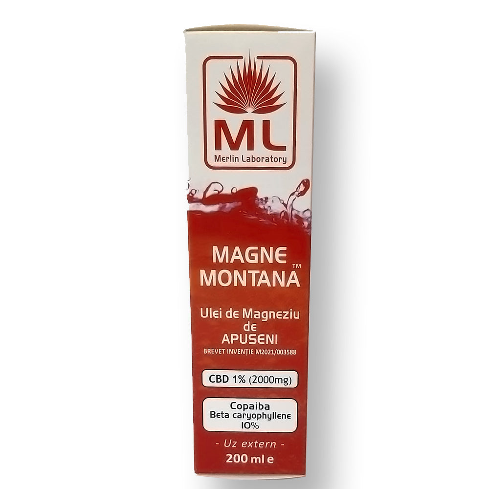 Magne-Montana-Ulei de Magneziu de Apuseni este un remediu antiimbatranire. Intareste oasele si dintii, util in probleme de fertilitate, trateaza tulburarile digestive (colici,balonari,constipatie,indigestie). Indeparteaza afectiunile cutanate, calmeaza sistemul nervos, usureaza astmul bronsic (in tandem cu Bronhovegul si Ulei de Eucalipt Albastru – Laboratoarele Merlin). Scade intensitatea durerii (inclusiv durerile premenstruale). Contribuie la asimilarea calciului, regulator al aritmiilor cardiace, fluidizeaza sangele si reduce spasmul coronarian reducand riscul de moarte subita. Este esential in crizele de angina pectorala si este util in AVC -accidente vasculare cerebrale. Amelioreaza rezistenta la insulina, amelioreaza efectele stresului la adulti ca urmare a Parkinsonului si Alzheimerului. Extractul terpenic de Copaiba (Beta-Caryophillene) este un puternic antiinflamator natural de pe planeta. Celelalte uleiuri esentiale sunt cunoscute pentru proprietatile lor generale-lavanda relaxant general, menta-antinevralgic, iar eucaliptul-antireumatic.