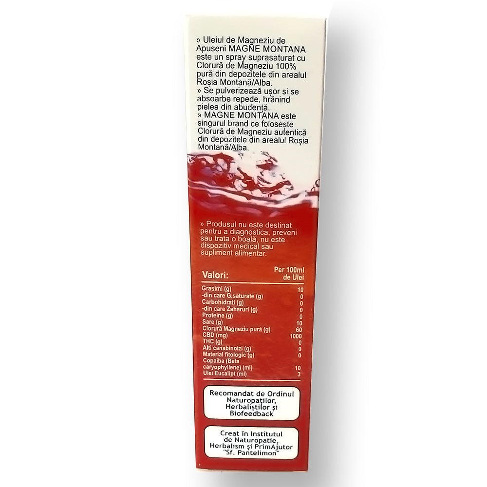 Ingrediente: Produsul este un complex de clorura de magneziu naturala, pura, apa demineralizata, extracte terpenice de beta-caryophyllene si extract cristalizat de cannabidiol (CBD-concentrat de cannabis sativa 0% THC) si eucalipt.