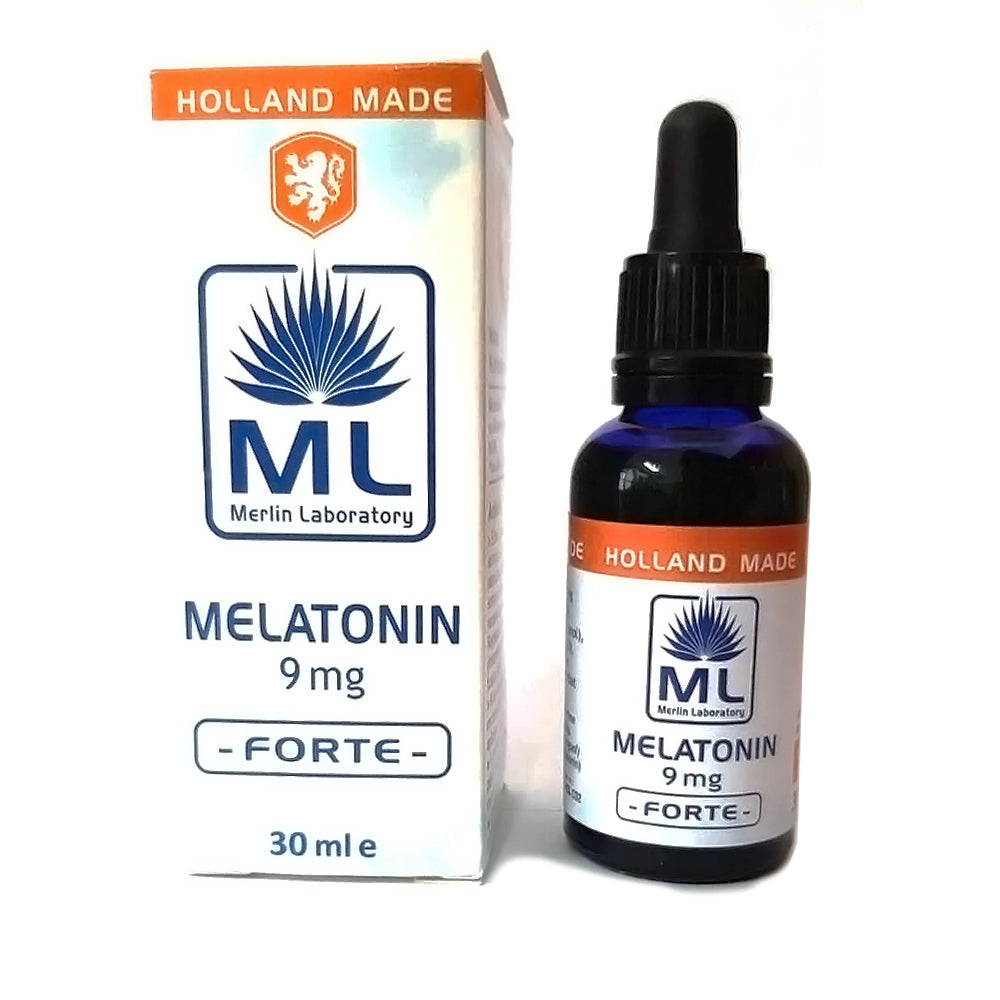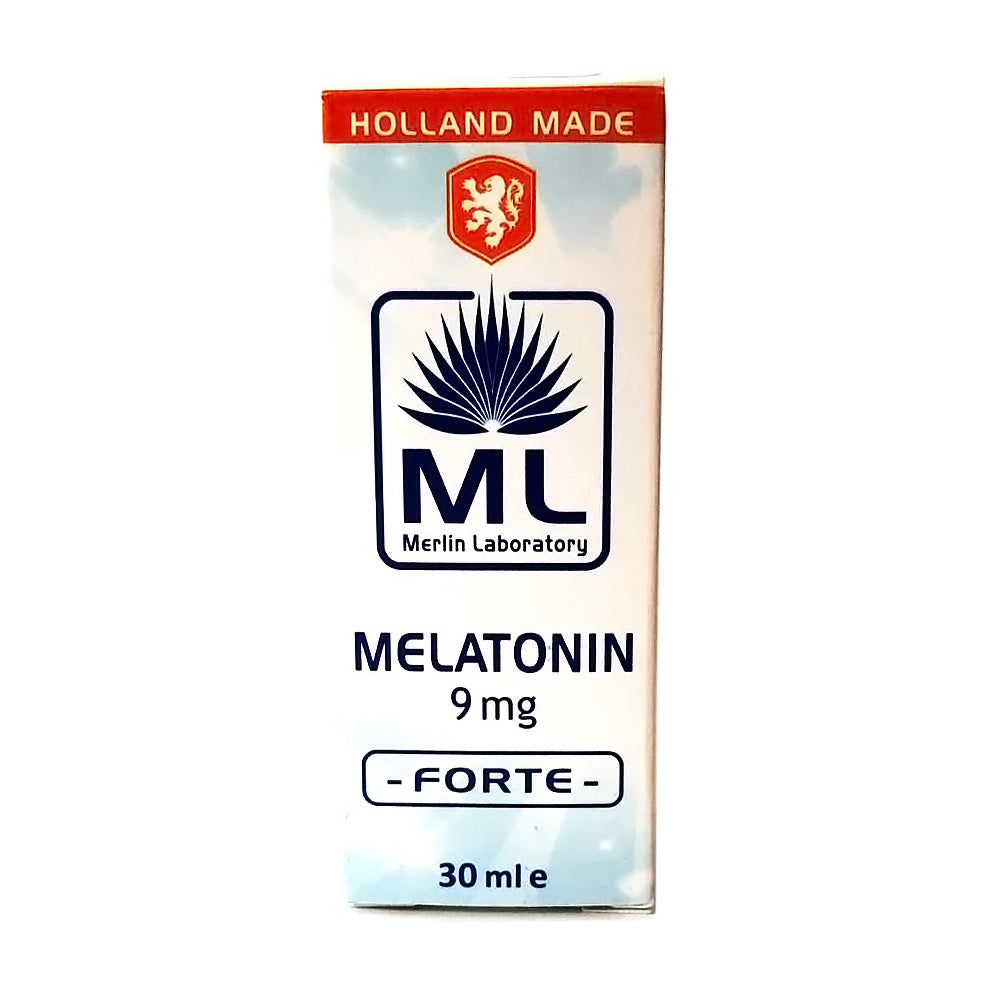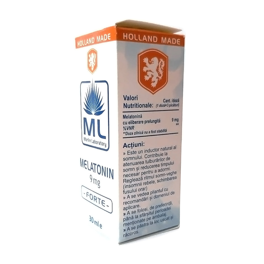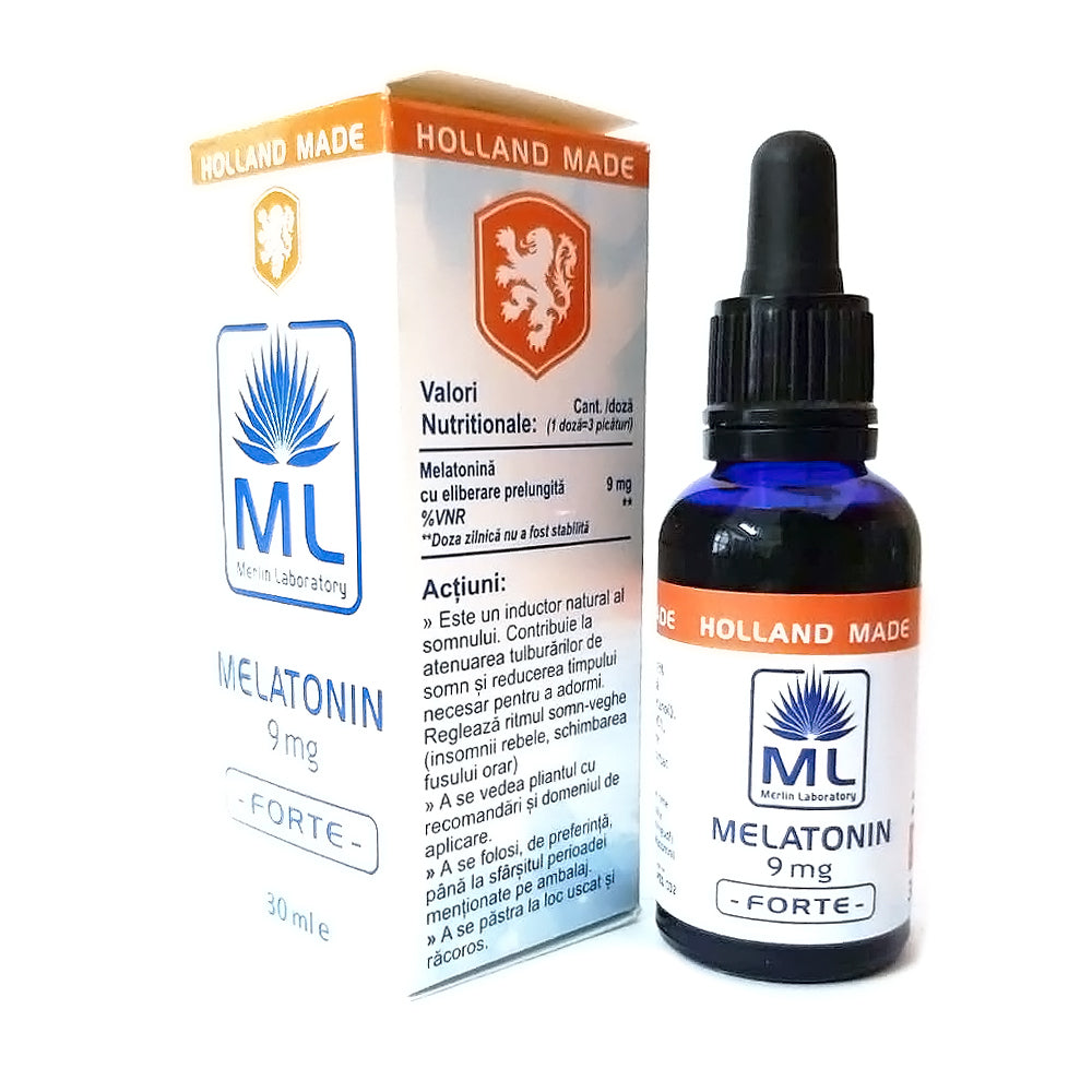 Melatonin Forte `Holland Made` Merlin Laboratory (9mg pe doza de 3 picaturi), adjuvant pentru reglarea ritmului circadian si a programului de somn (dupa administrarea de melatonina se adoarme mai repede), sustine organismul in fata depresiilor sezoniere si a starilor de neliniste, inhiba starile negative, amelioreaza starile de confuzie dupa interventii chirurgicale si este de ajutor in perioada menopauzei.