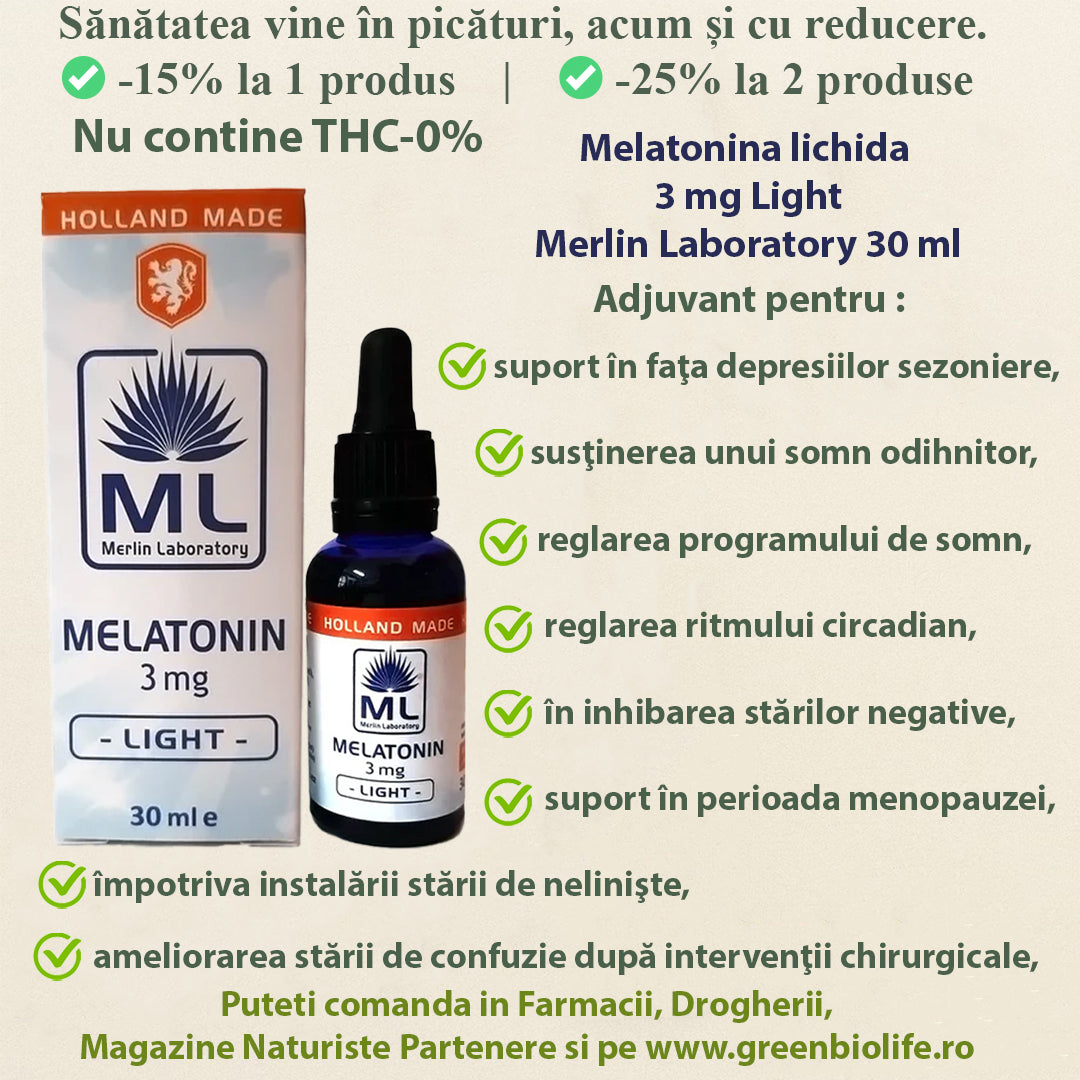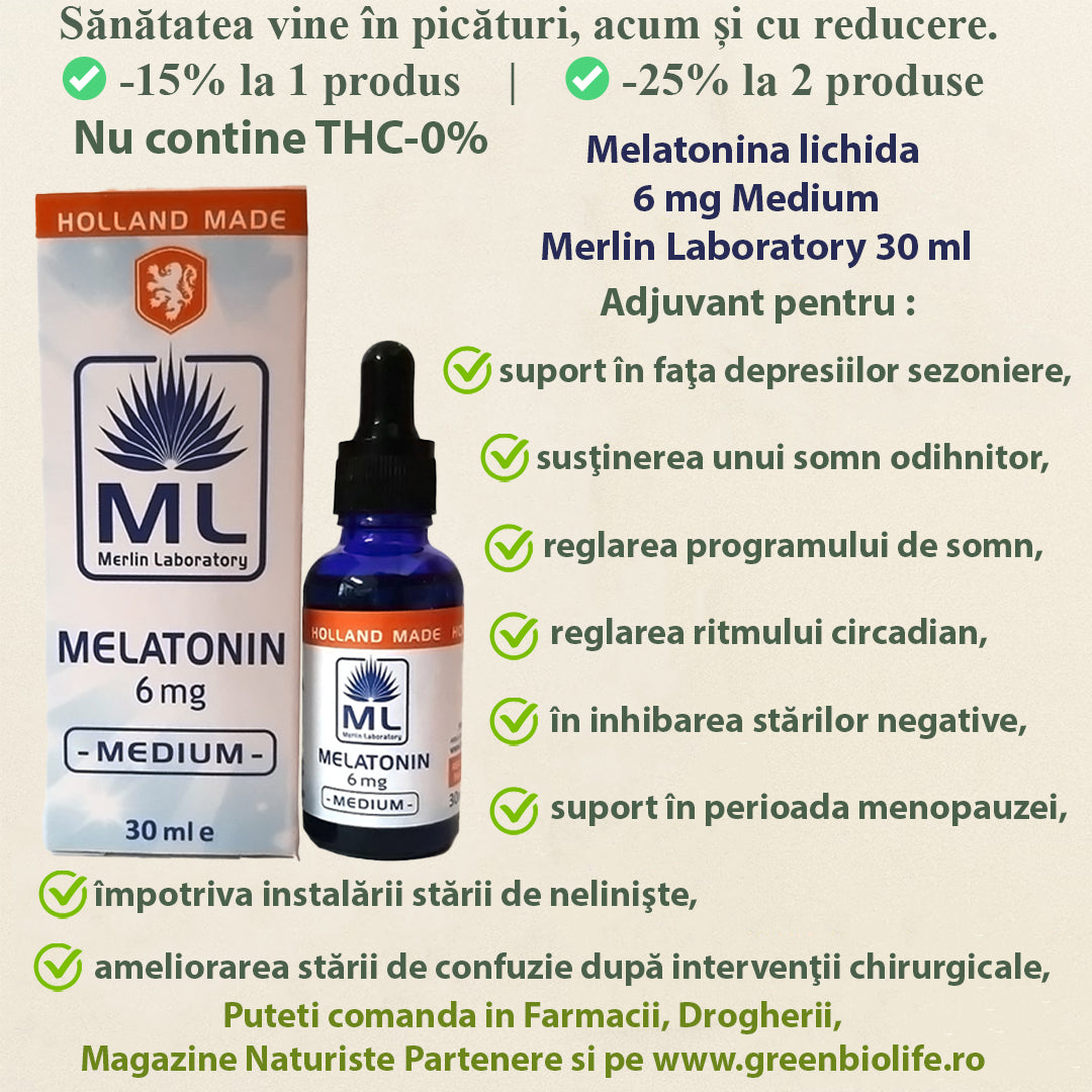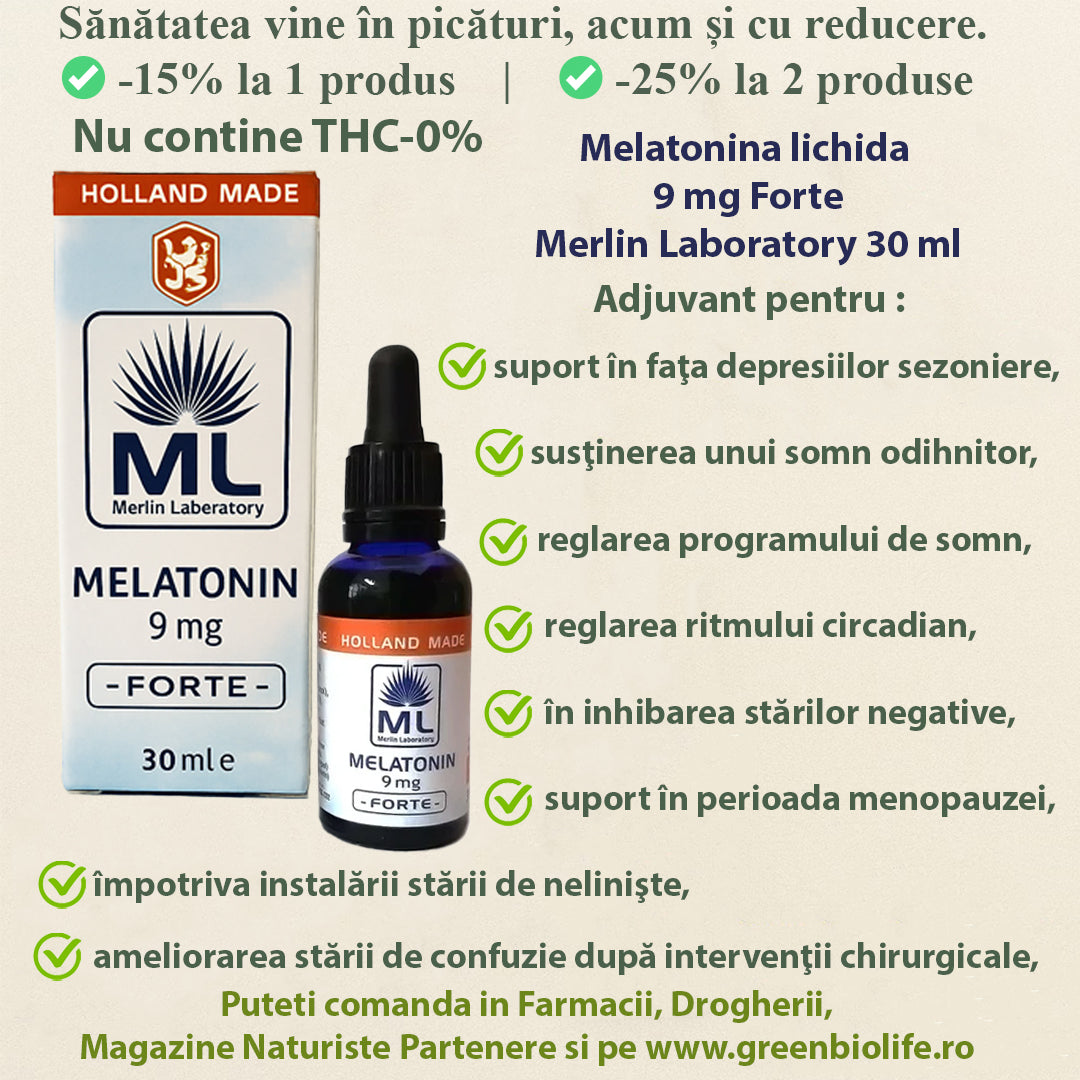 Melatonin Forte `Holland Made` Merlin Laboratory (9mg pe doza de 3 picaturi), adjuvant pentru reglarea ritmului circadian si a programului de somn (dupa administrarea de melatonina se adoarme mai repede), sustine organismul in fata depresiilor sezoniere si a starilor de neliniste, inhiba starile negative, amelioreaza starile de confuzie dupa interventii chirurgicale si este de ajutor in perioada menopauzei.