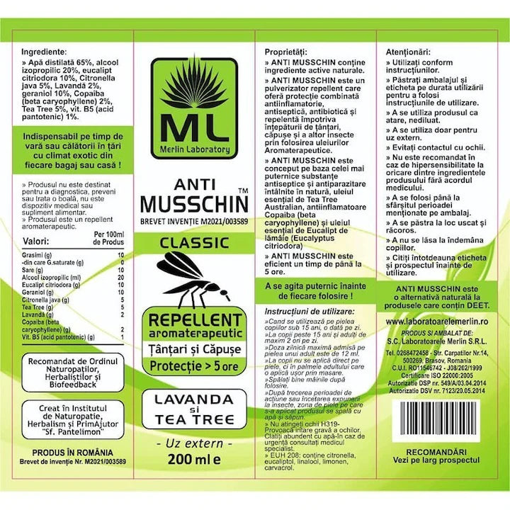Spray / pulverizator repelent ce protejeaza impotriva intepaturilor de tantari, capuse si alte insecte ce ne `tortureaza` pe timpul verii. Are o formula bazata pe una dintre cele mai puternice substante naturale cu actiune antiseptica si antiparazitara, uleiul esential de tea tree australian si antiinflamatoare, copaiba (beta caryophyllene), la care se adauga uleiul esential de eucalipt de lamaie (Eucalyptus citriodora). `Anti Musschin Classic - Repellent aomaterapeutic cu Lavanda si Tea tree` are efect de protectie de pana la 5 ore, oferind protectie combinata antiinflamatorie, antiseptica, antibiotica si repelenta impotriva tantarilor si capuselor.