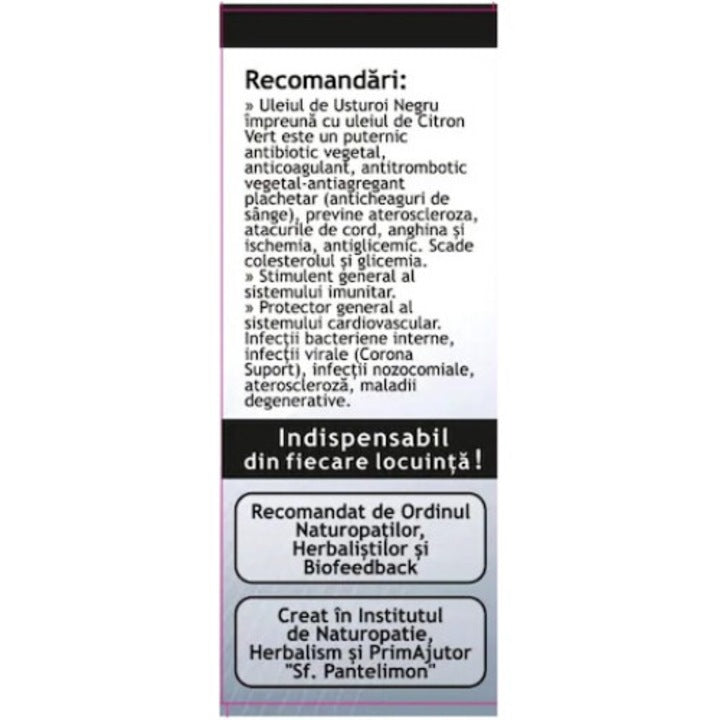 Uleiul de Usturoi Negru este un puternic antibiotic vegetal, anticuagulant, antitrombotic vegetal - antiagregant plachetar (antichiaguri de sange) previne ateroscleroza, atacurile de cord, anghina si ischemia, antiglicemic.