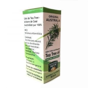 Ulei esential botanic si biochimic bine definit, obtinut din cultura ecologica prin distilarea completa in vapori de apa a frunzelor arborelui de ceai. Denumire stiintifica – Melaleuca alternifolia, Tara de origine garantata: Australia. Proprietatile organoleptice ale acestui ulei essential sunt date de un lichid limpide, incolor spre galben pal, un miros puternic de proaspat, ierbos cu o lunga utilizare in cosmetica, aromaterapie si terapii conventionale.